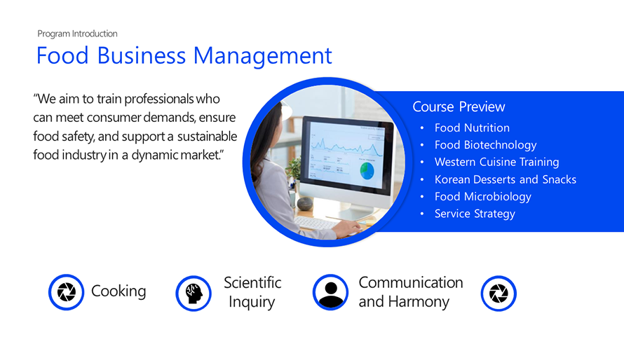| In the Food Biotechnology course, you can acquire the basic genetic and molecular biology principles of life phenomena, understand the diversity of biotechnology applied to living organisms, and learn techniques for utilizing it in various fields such as medicine, agriculture, food, energy, resources, and the environment. |