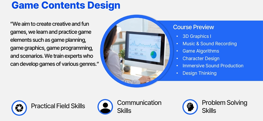 | Educational Objective | In order to create creative and fun games, we learn and practice game elements such as game planning, game graphics, game programming, and scenarios. Through this curriculum, we train experts who can develop games of various genres. |
